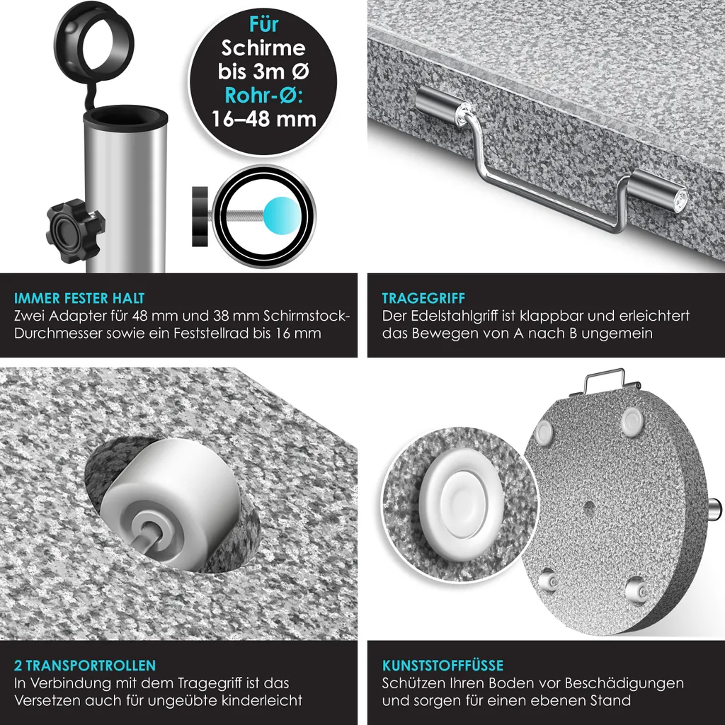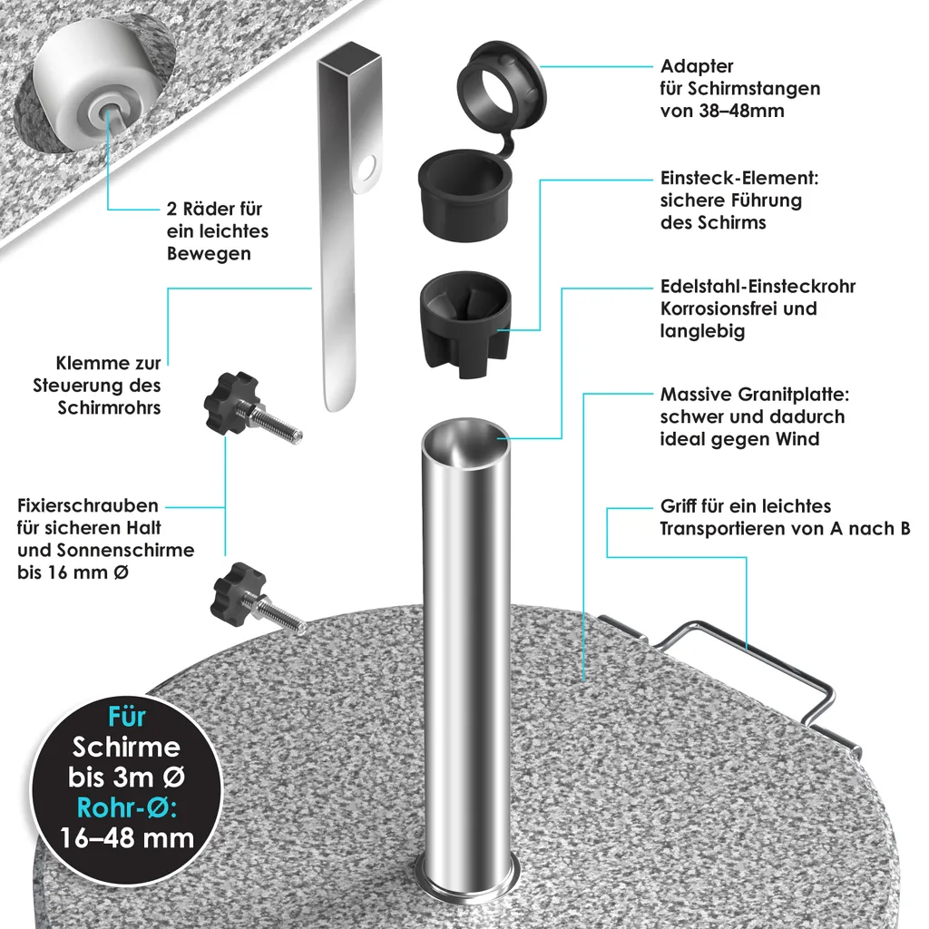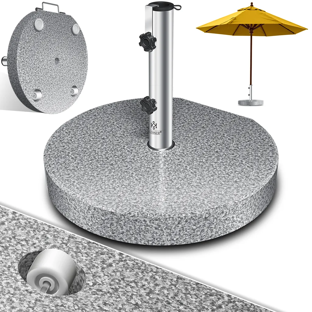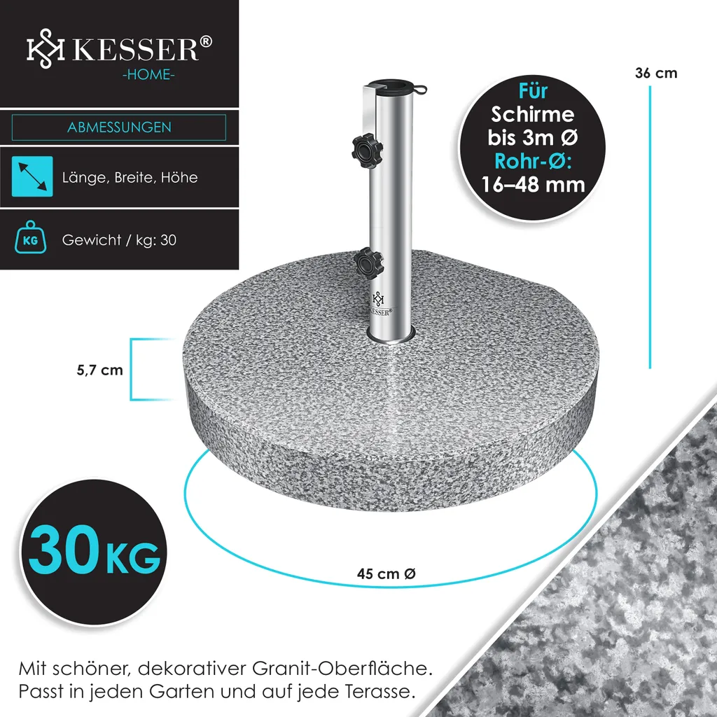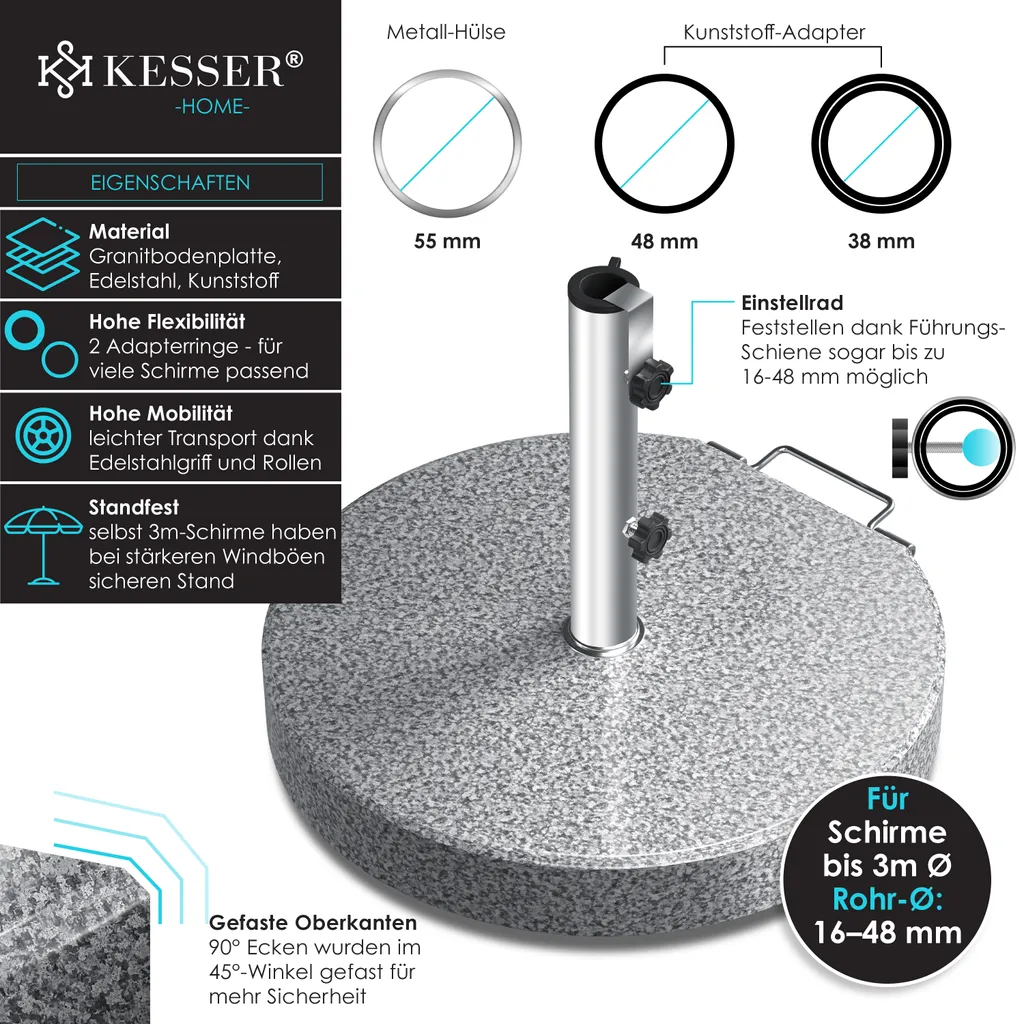 KESSER® Granit Sonnenschirmständer Mit Edelstahlrohr, Hochwertiger Schirmständer Sockel 25KG – Für Schirmstöcke Bis 16-48 Mm, Inkl. Transport Griff Garten Balkonschirmständer, Farbe:Grau, Größe:Rund