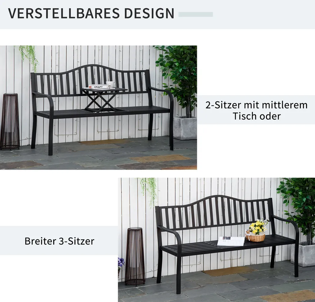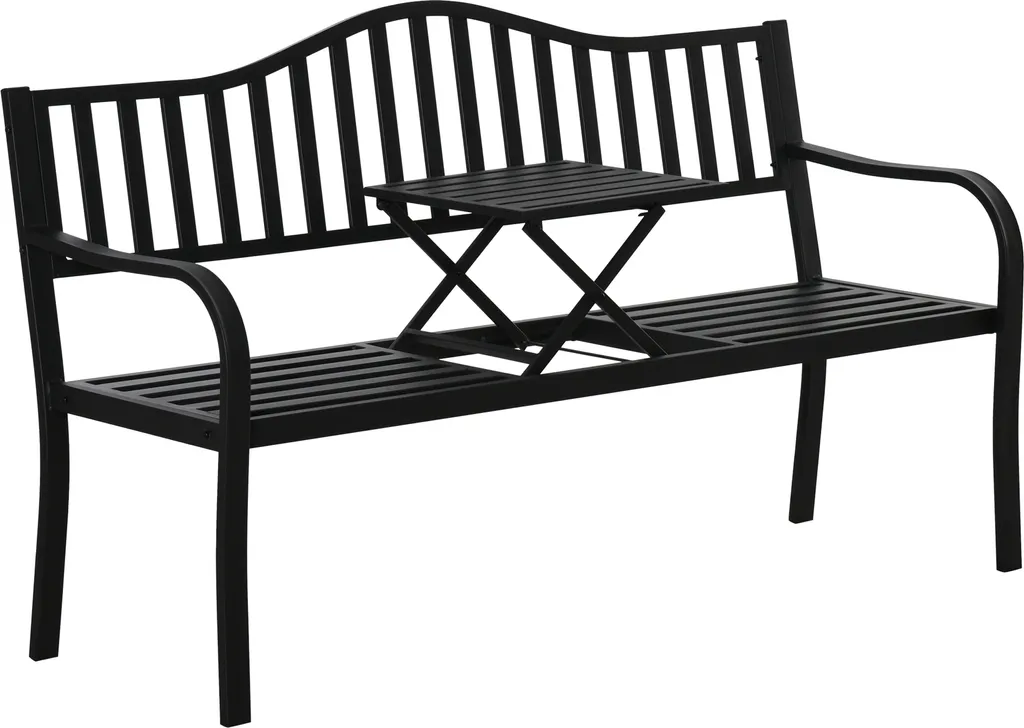 Outsunny Gartenbank Mit Ausziehbarem Tisch Für 2-3 Personen Parkbank Aus Metall Sitzbank Bank Terrassenbank Mit Rücken- & Armlehnen Gartenmöbel Schwarz 150 X 58,5 X 90 Cm