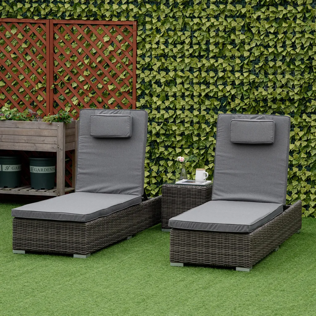 Outsunny Poly-Rattan Sonnenliege 3-tlg. Gartenliege Mit 6-Fach Verstellbarer Rückenlehne Beistelltisch Nackenkissen Gartenmöbel Aluminium Grau 60 X 195 X 91 Cm