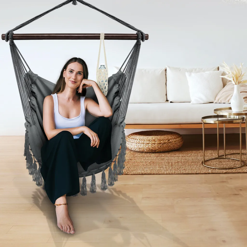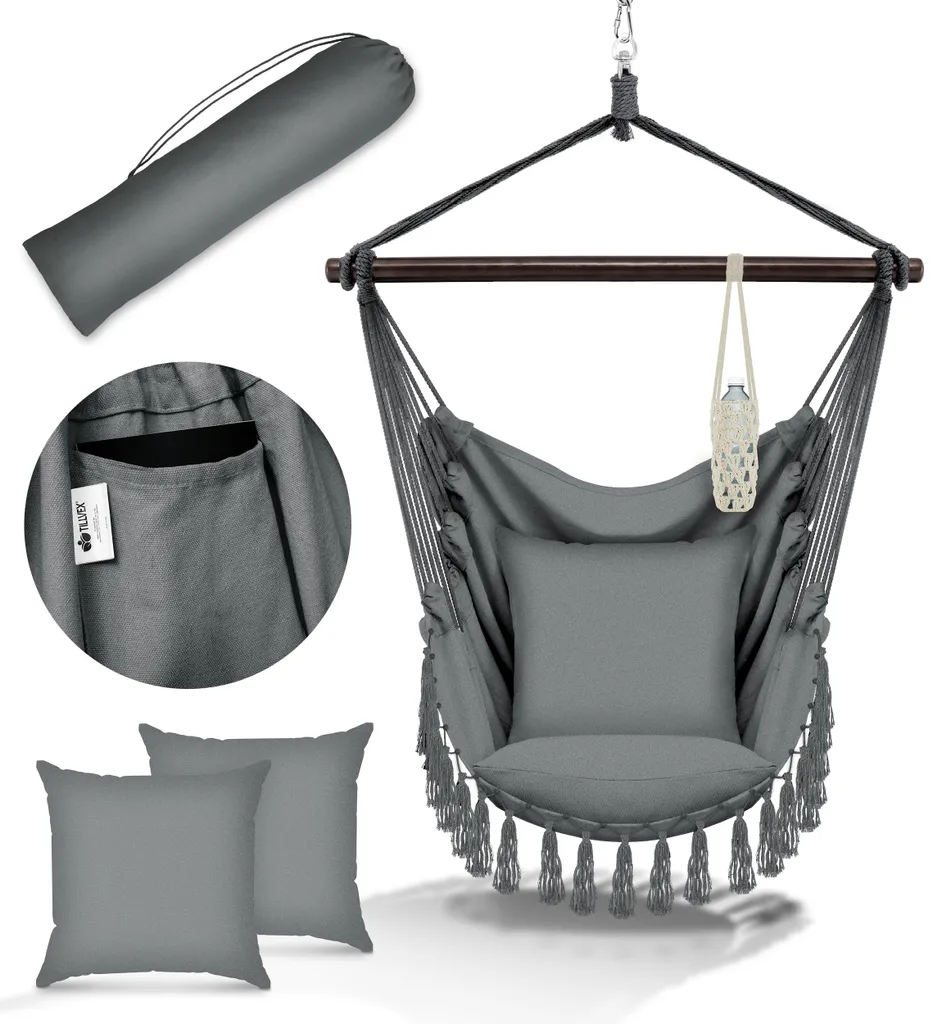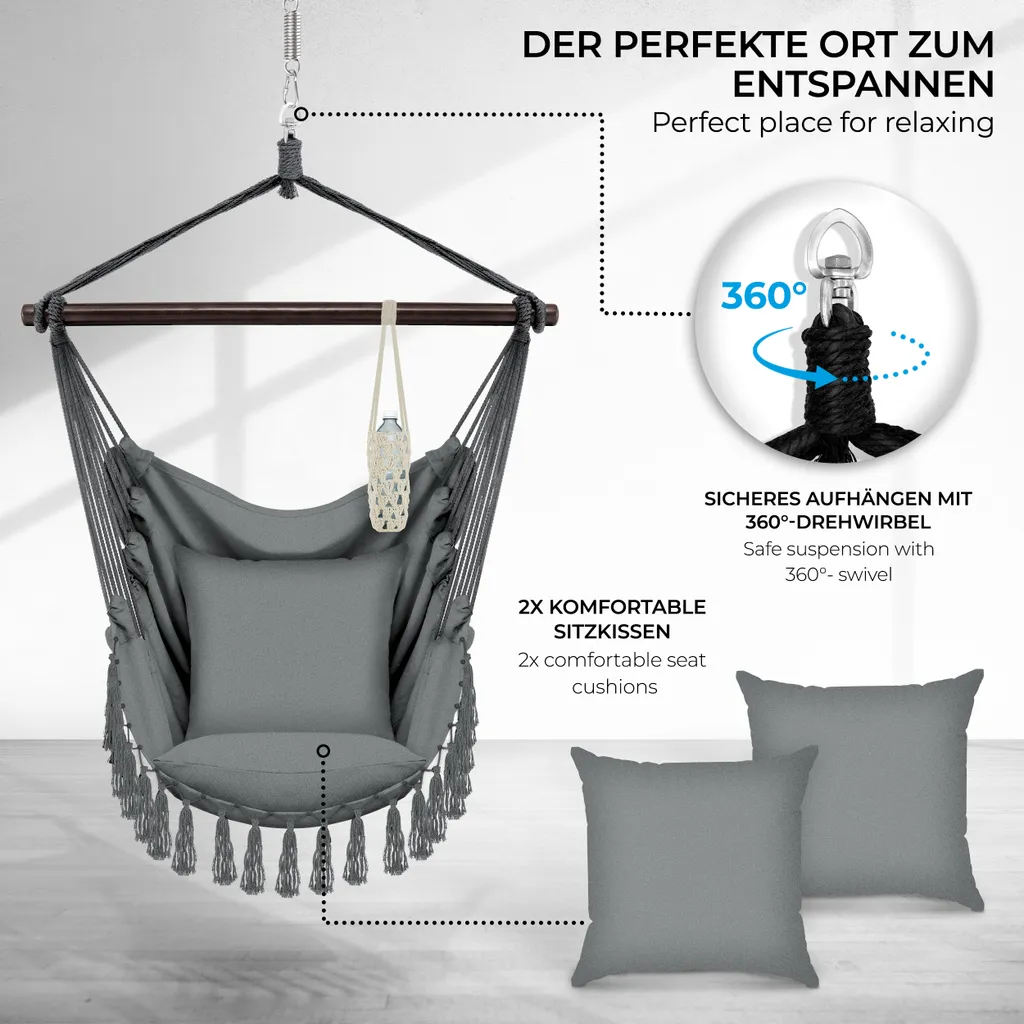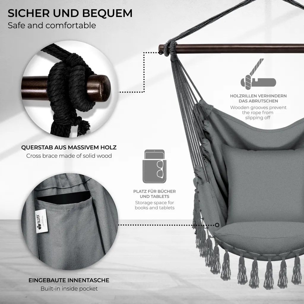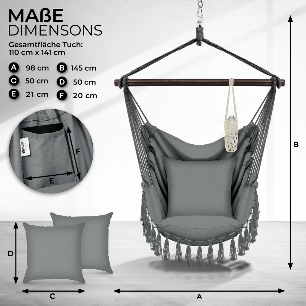 Tillvex Hängesessel Grau 2 Kissen Zum Aufhängen | Hängestuhl Mit Getränkehalter & Bücherfach | Hängesitz Wetterfest – Indoor & Outdoor | Hängekorb Mit Tragetasche Für Erwachsene & Kinder