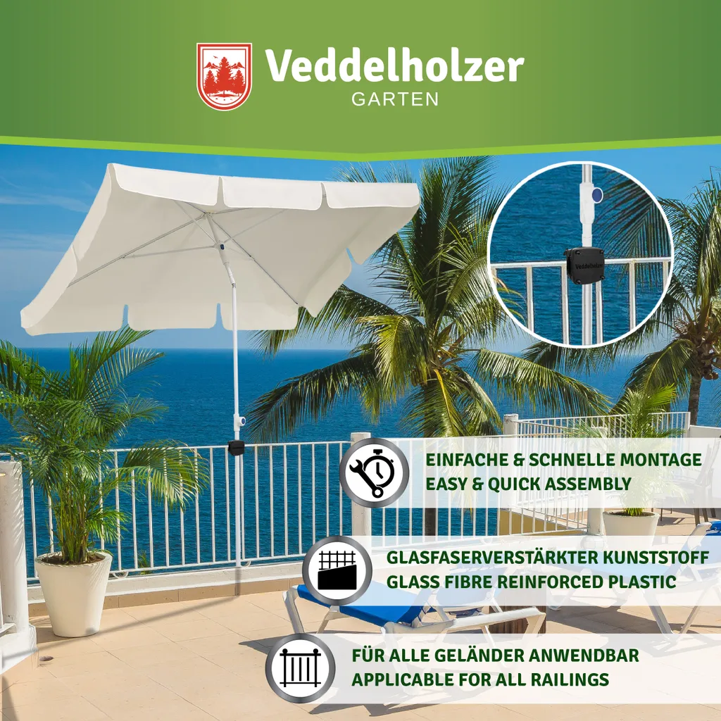 Veddelholzer Sonnenschirmhalter Für Balkongeländer-Robuste, Universelle Schirmhalterung Eckig & Rund, Platzsparender Ersatz Zum Sonnenschirmständer Balkon Für Jeden Schirmstock Geeignet.
